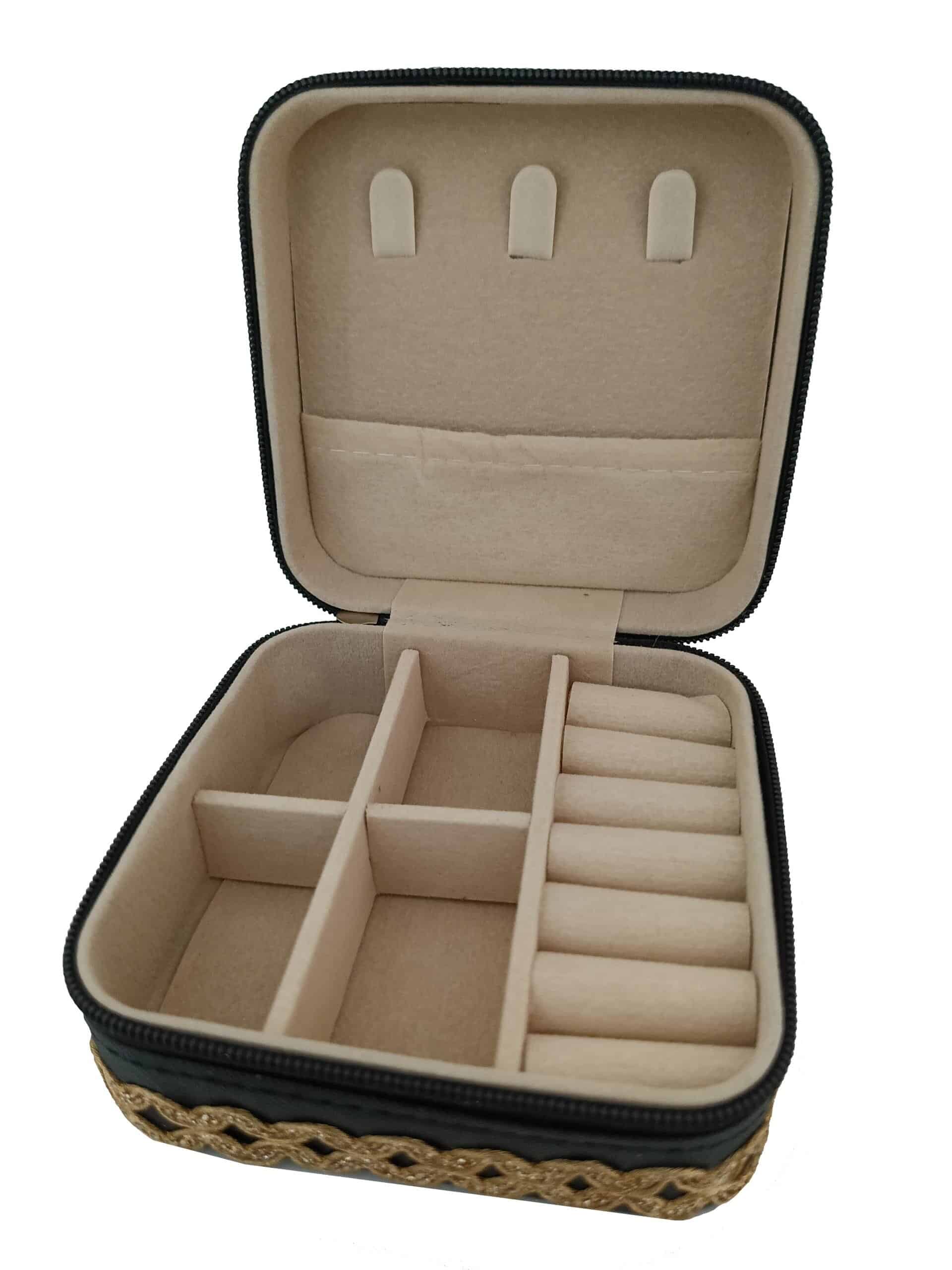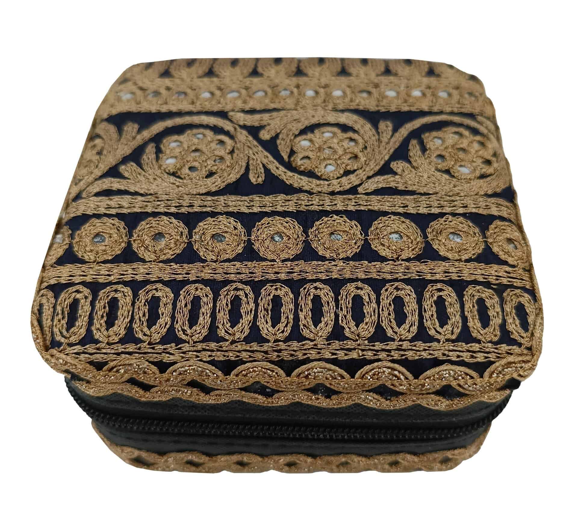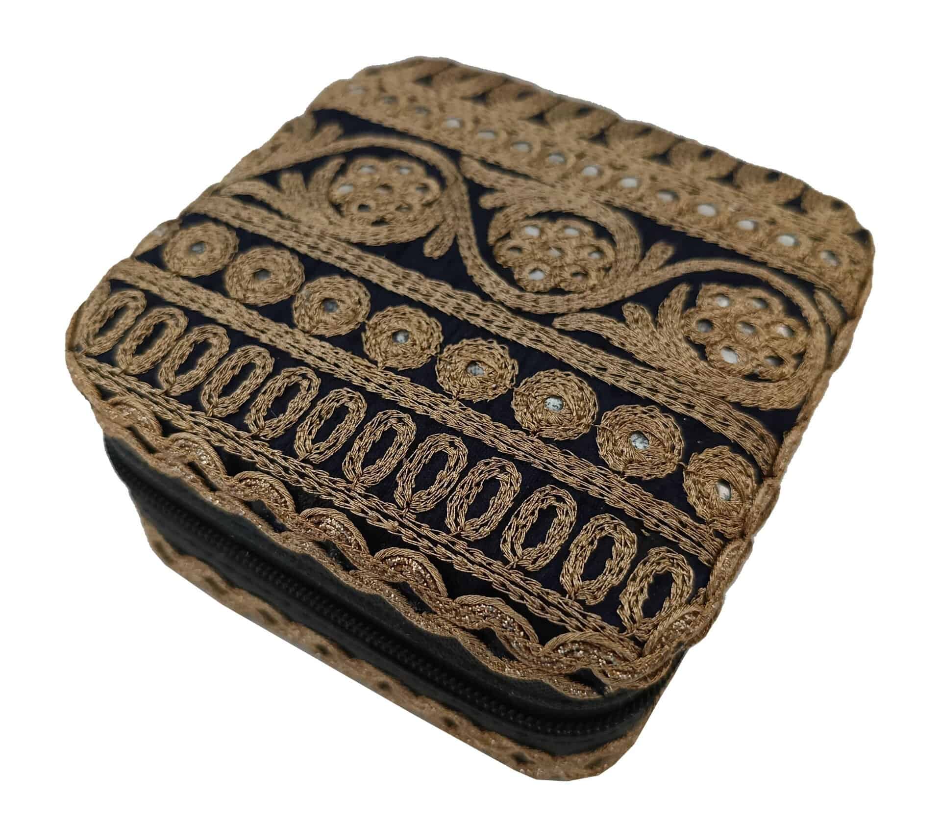 Dit prachtige sieradendoosje met unieke details is perfect om je favoriete Loffs sieraden in te bewaren. Naast functionaliteit voegt dit sieradendoosje ook een vleugje stijl, elegantie en eigenheid toe aan je kaptafel. Het sieradendoosje heeft diverse vakjes en details aan de binnenkant om al je favoriete sieraden mooi en overzichtelijk in op te bergen. Het doosje is makkelijk af te sluiten door middel van een rits. Ideaal ook om mee te nemen op reis. Onze sieradendoosjes zijn vervaardigd van kleurrijke linten en stoffen uit India. Deze selecteren wij met liefde en zorg en worden met de hand gemaakt door getalenteerde ambachtslieden in India. Zij werken onder eerlijke werkomstandigheden en een ontvangen een eerlijk loon voor hun vaardigheden.
